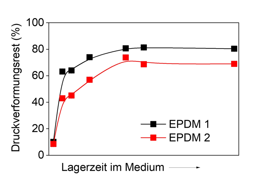 Für eine Dichtungsanwendung mit einem langzeitigen medialen Einwirken sollte der geeignete Werkstoff identifiziert werden. Dazu wurde eine umfassende Beständigkeitsuntersuchung angesetzt. Die beiden vorausgewählten EPDM-Werkstoffe wurden im Ausgangszustand und nach unterschiedlichen Lagerungszeiten in dem betreffenden Medium bei Anwendungstemperatur (oberhalb 80 °C) mit unterschiedlichen Verfahren geprüft. Die maximale Lagerzeit orientierte sich an der gewünschten Mindest-Lebensdauer des Produkts und betrug mehrere tausend Stunden. In Bild 1 ist exemplarisch die Veränderung des Druckverformungsrestes mit der Zeit gezeigt. Es ist erkennbar, dass beide EPDM-Werkstoffe im Ausgangszustand einen vergleichbaren Wert aufweisen, über die Zeit sich jedoch Unterschiede ergeben.