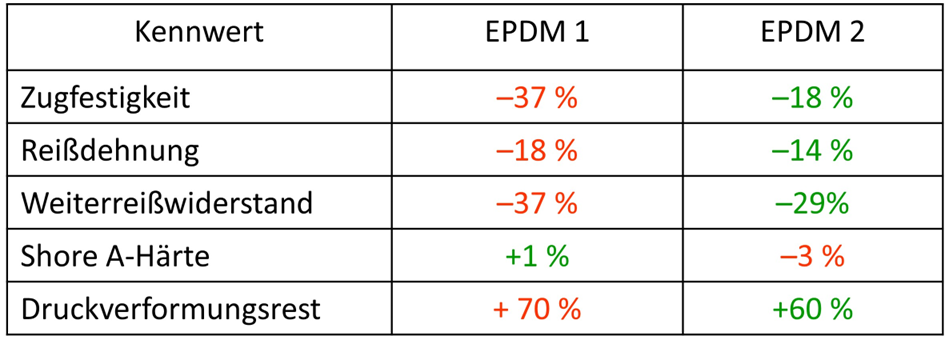 Tabelle 1 zeigt das umfassende Eigenschaftsbild nach der Langzeitlagerung in Form der prozentualen Veränderungen. EPDM 1 zeigt m Gesamtbild deutlich stärker ausgeprägte Veränderungen der mechanischen Eigenschaften im Vergleich zu EPDM 2 und kommt deshalb für die Anwendung weniger in Frage.