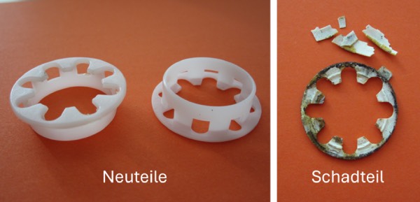 Bild 1: POM-Stützringe im Neuzustand und als Reklamationsgrund (Schaden)